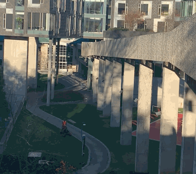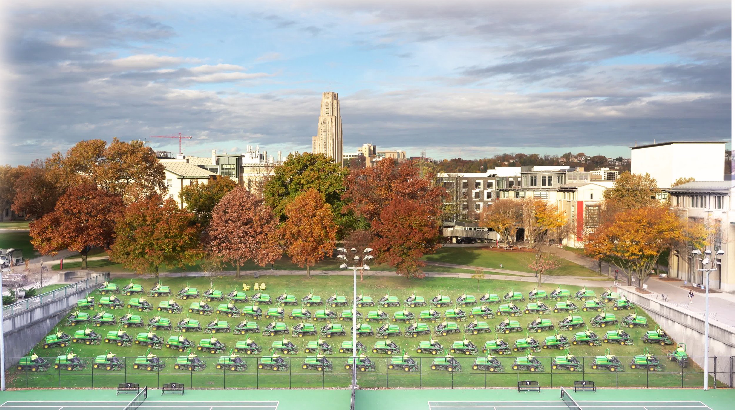 I spent early mornings setting up tripods on rooftops and in fourth-floor windows, capturing time-lapse footage of Mario mowing, Nate edging the Tepper lawn, Steve working the sloped hill by the tennis courts. I followed Mario around for two and a half hours as he blew leaves off Forbes Avenue.