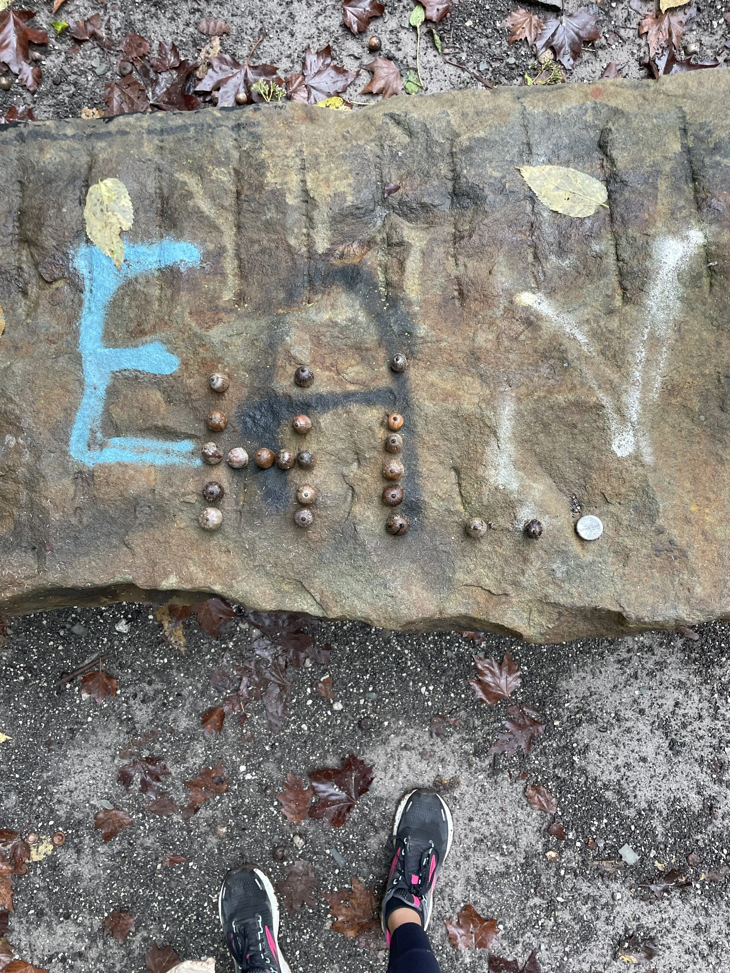 One morning, I left a message spelled out in acorns on the bench. Days later, someone rearranged the acorns into a new message: "Hi." It felt like mystical telepathy.