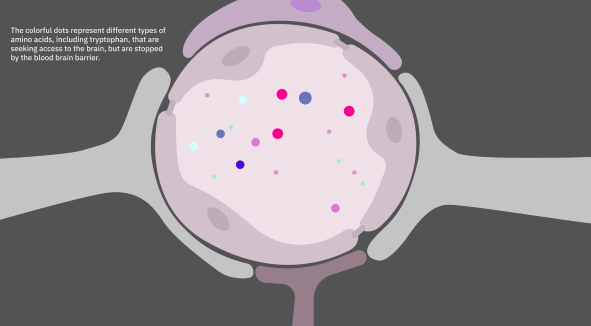 The colorful dots represent different types of amino acids, including tryptophan, that are transported across the blood brain barrier.