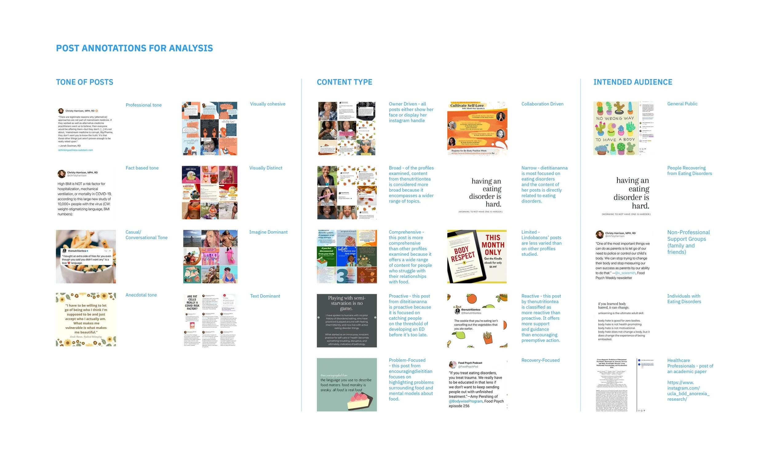 I reviewed 32 profiles, developing evaluation frameworks to assess tone, content quality, intended audience, and content categories.