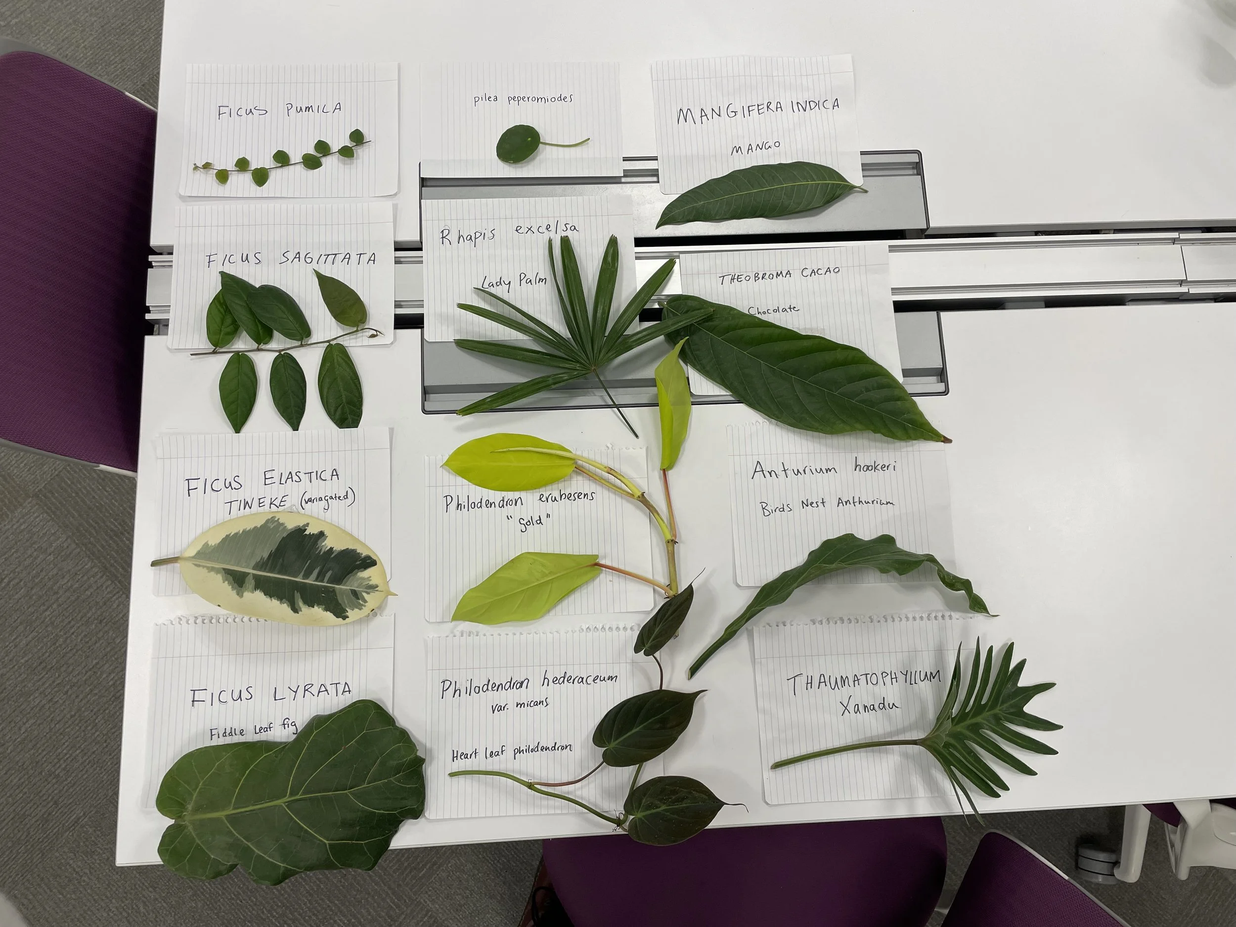 Our leaf recognition model was trained on various photos of the fourteen species shown here. We had multiple samples of each species and photographed each leaf from different angles. It was a relief that the model could recognize not just the leaf we trained it on, but other leaves of the same species. It was also great that these leafs were consistently available from Phipps since they are from species that are constanly shedding leaves.