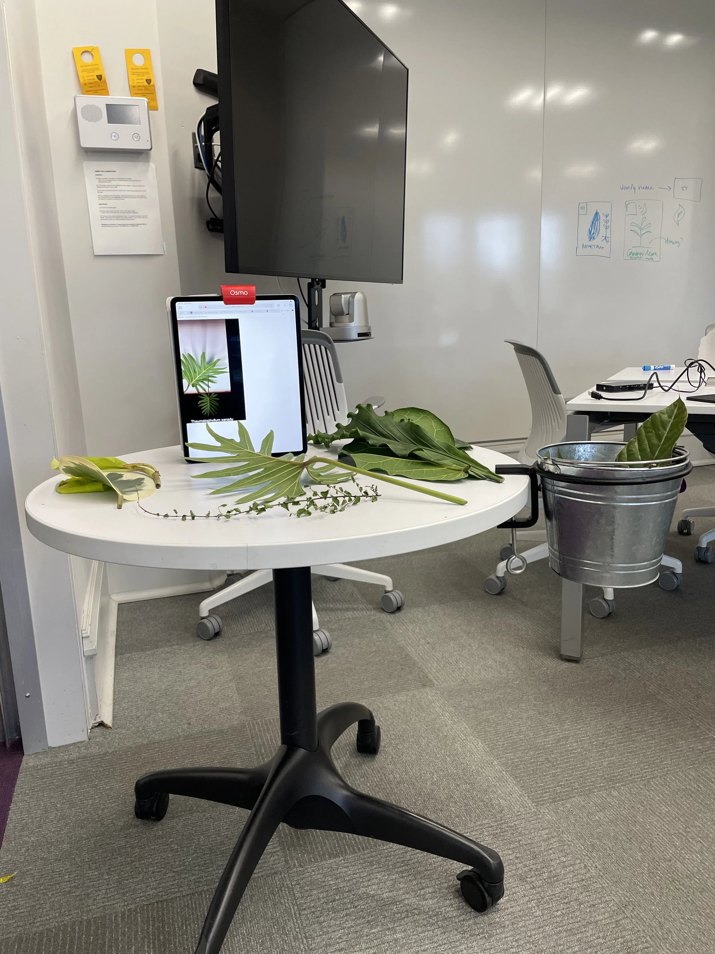 Our plant ID station went through several iterations. This is our initial prototype, where we were using an iPad to recognize the leaves and were displaying a very simple image the indicated leaf recognition on the iPad screen.